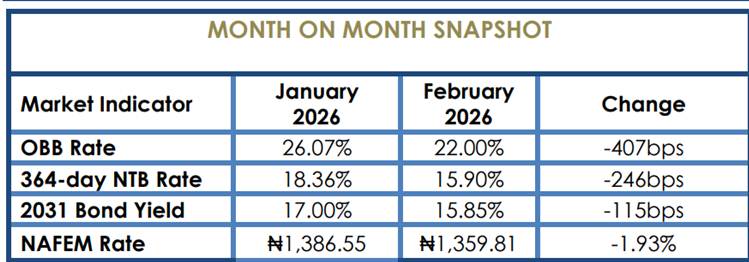 The Debt Management Office’s February bond auction was a turning point. Total subscriptions of ₦2.70 trillion against an offer of ₦800 billion resulted in ₦524.27 billion allotted at lower stop rates— 15.74% for 2032s and 2033s, 15.50% for 2034s. Following the auction, mid-tenor bonds rallied, with Jun 2032 at 15.60%/15.35%, May 2033 at 15.30%, and Feb 2034 at 15.40%/15.30%, driving average benchmark yields down by ~50bps from early month levels.